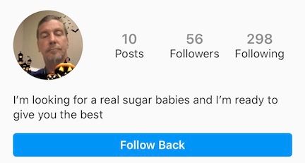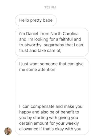 Every few weeks or so, I receive an Instagram message request from what appears to be an old white dude with suspiciously few followers. The greeting usually goes something like this: "I'll pay you $xx a week for you to be my sugar baby." Typically the bio on the profile says something similar, "looking for a real sugar baby," "ready to spoil you," "I want to give you the best."