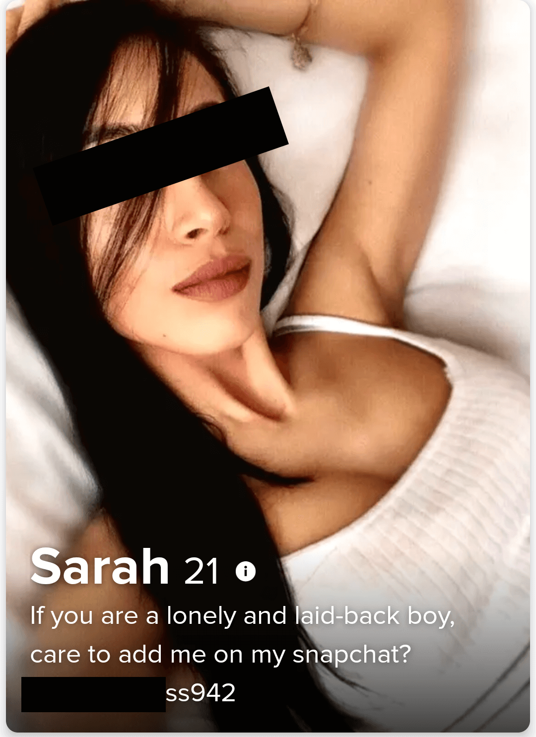The setup is simple: affiliate marketers create thousands of hoax dating profiles that in turn point to fake Snapchat accounts: there, they promote various adult websites that pay a commission for referrals. I suppose these contemporary hawkers could at least be a little more creative with their Snapchat handles: they all (and I mean ALL!) end with a three-digit number.