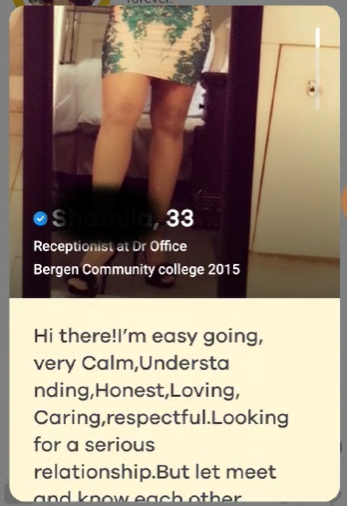 The distinctive broken English (seen in the examples below) used by West African scammers is often a smoking gun that helps dating apps weed out their fake profiles. But criminals can get creative and occasionally navigate their way through layers of technology and human moderation: one such example is below on the right — rather than steal pictures online to create a fake profile, these scammers must have used an accomplice to open an account using her actual image, thus earning the blue photo verification badge of one of the dating apps that I admire the most (and that I know is extremely diligent about policing its community).